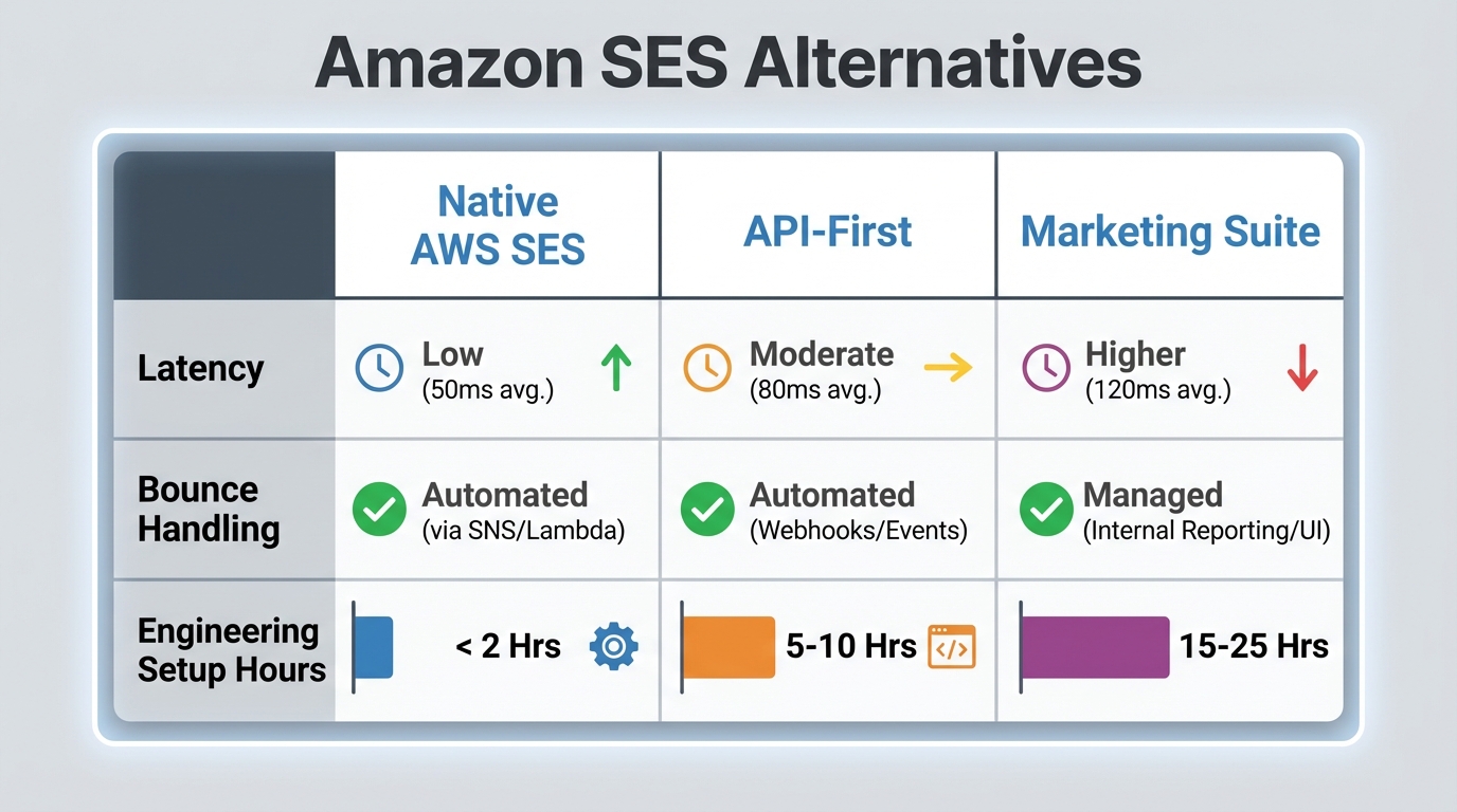 SES makes sense if you are already running on AWS infrastructure and have DevOps capacity to maintain bounce handling and suppression logic; if you have extremely high volume and can justify the engineering overhead against the per-email cost savings; or if you need maximum control for compliance reasons (HIPAA, PCI) and prefer self-hosted approaches. For most other cases, a managed alternative saves meaningful engineering time. According to SoftwareTestingHelp, SES remains viable for teams with strict compliance requirements or those already deeply embedded in the AWS ecosystem.