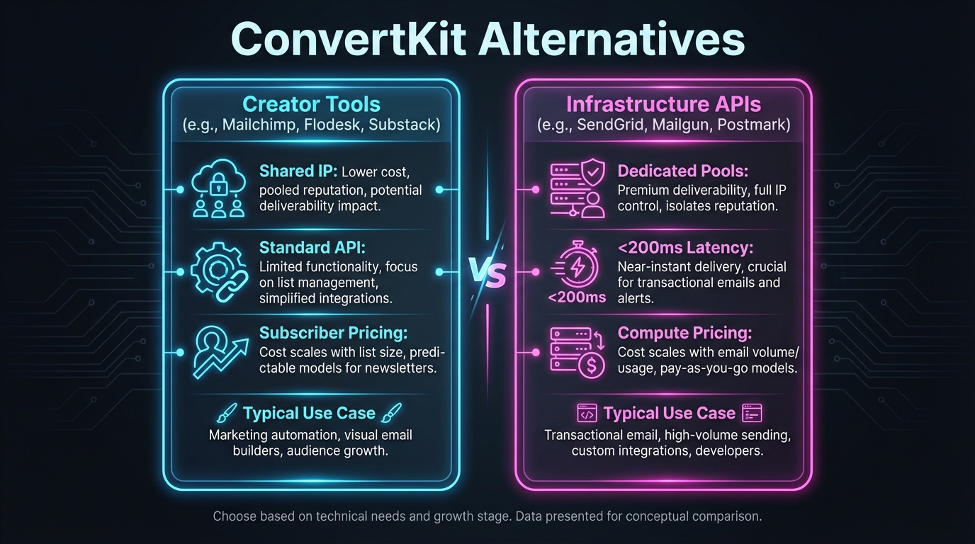A technical ConvertKit alternative is an email delivery platform designed for software teams and SaaS companies rather than individual creators. Unlike Kit (formerly ConvertKit), which optimizes its interface for newsletter writers and solopreneurs, technical alternatives prioritize API latency, webhook event routing, reputation isolation per domain, and infrastructure control through bring-your-own-key (BYOK) AWS integration. This distinction matters because creator-focused ESPs route emails through shared sending pools that can expose growing SaaS platforms to reputation damage from other senders on the platform. They also lack the sub-200ms transactional API speeds required for authentication flows, password resets, and real-time notifications in modern applications.
