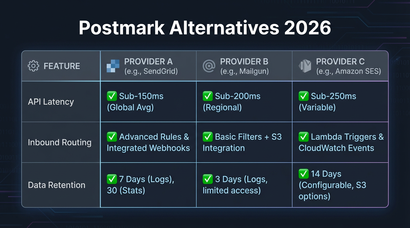 The real decision is not just price. It is latency profiles, inbound email handling, and the operational friction of switching infrastructure mid-product. This guide compares nine transactional email providers on the metrics that matter to developers: API latency under load, webhook structure for inbound handling, data retention windows, and the cost-versus-feature tradeoffs at meaningful send volumes.